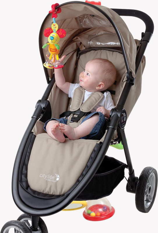 De clip is eenvoudig te bevestigen aan kinderwagens, buggy's of autostoeltjes.