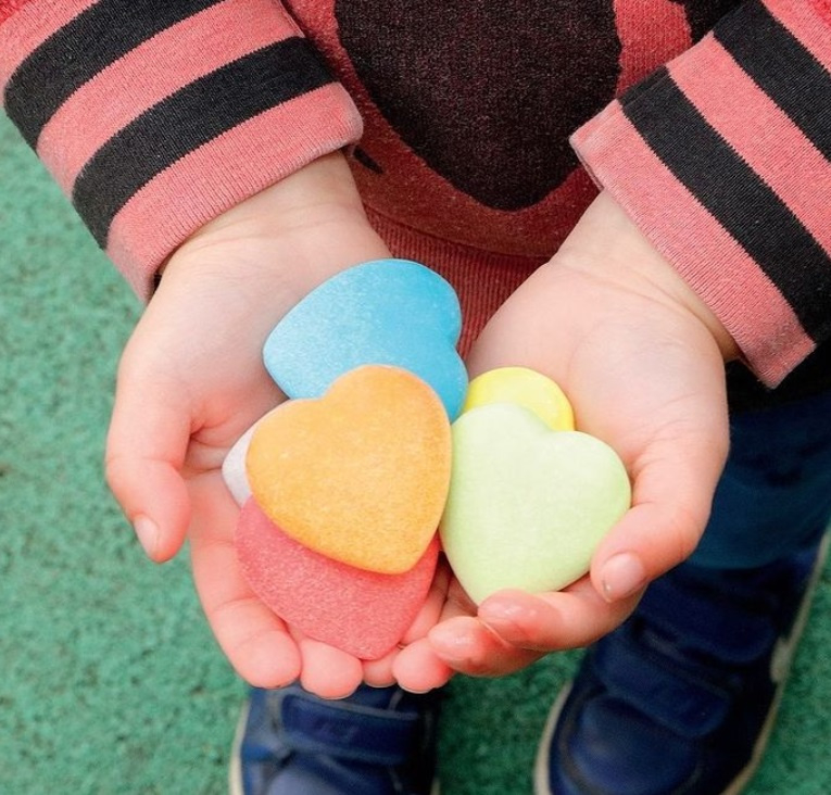 De set bevat 16 hartjes. Twee van elk acht verschillende kleuren. Maat 40mm. Gemaakt van echte steen- en harsmix.